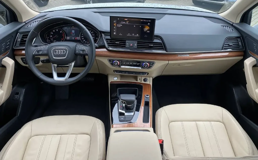 The interior of the Audi Q5 is a spacious and well-appointed space. The cabin is built with high-quality materials and features a sleek, modern design that is both stylish and functional. The comfortable front seats are supportive and offer ample legroom and headroom, while the rear seats provide ample space for passengers as well. The interior is well-lit, with natural light filtering in through the large sunroof.